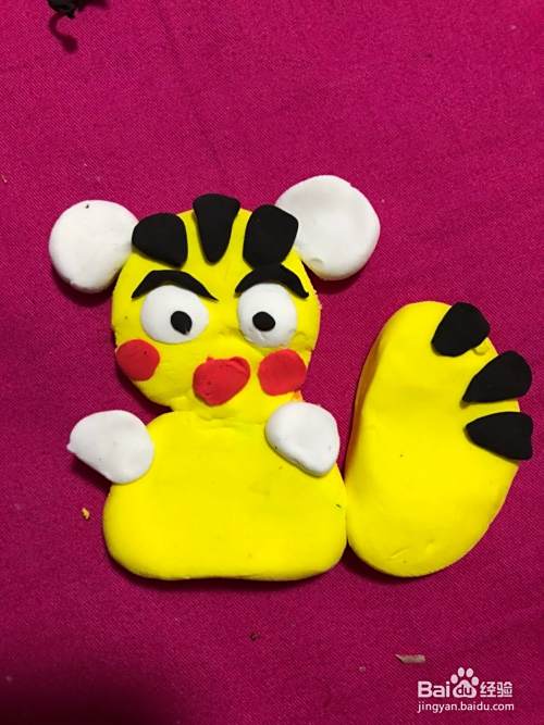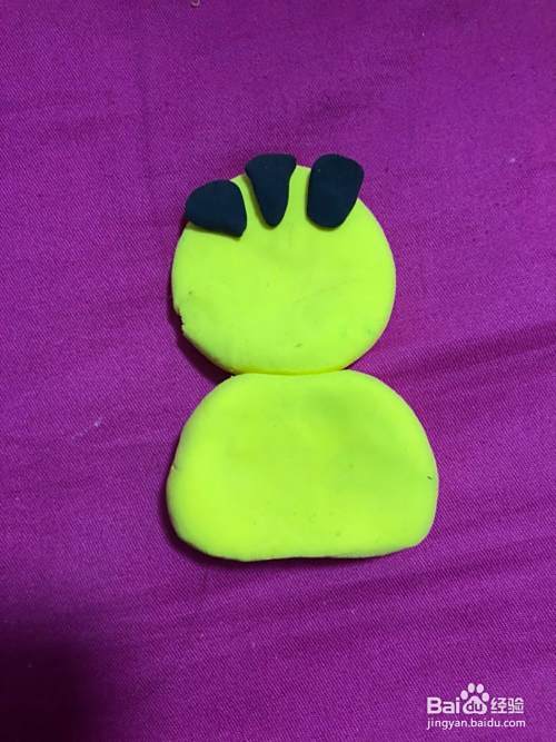 在拿出黑色的彩泥揉成弯弯的眉毛粘到上面,在拿出黄色的彩泥揉成半圆形粘到身体边上,在拿出黑色的彩泥揉成三个三角形,粘到半圆形,