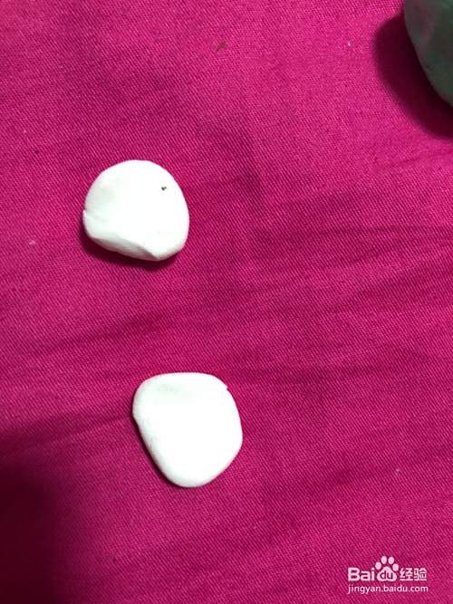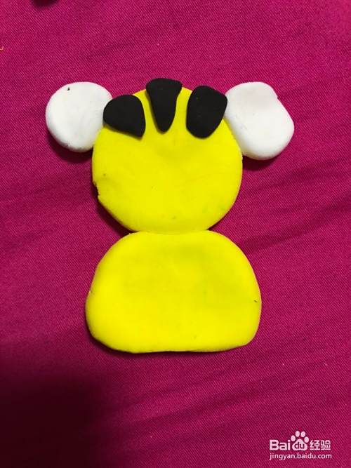 做成半圆形粘到圆形的两边,在拿出白色的彩泥揉成圆形按扁粘到圆形上面。在拿黑色的彩泥揉成两个圆形粘到白色上面,