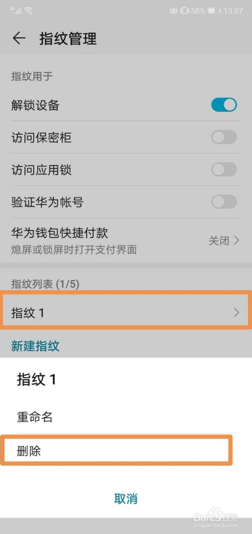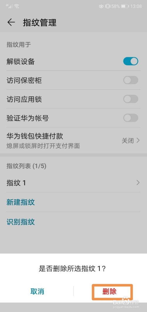 然后点击这里的指纹,接着我们选择删除。
