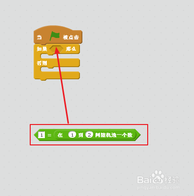 从数字与逻辑运算区拖出“=”脚本和“取随机数”脚本,“随机数”脚本改为从1到2间随机选一个数。