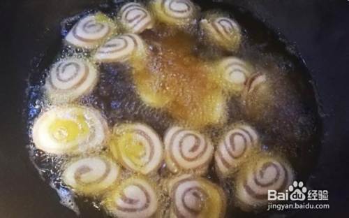 锅中放入适量的油,油热后,转小火,将切好的猫耳朵薄片,放入锅中进行油炸,慢慢炸至猫耳朵飘起,并且呈金黄色就可以出锅了