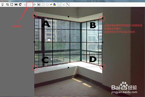 选好区域后,点击“透视调整”,让透视区域的四条虚线与所选区域的墙角走势重合,同时透视中的英文字母成正方形状。编辑完成后,点左上角保存;