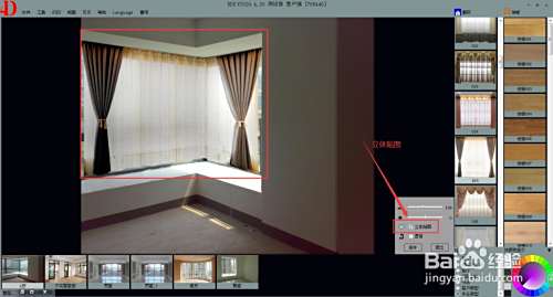 在悬挂窗帘的时候,在窗帘区域右键点击,选择“区域属性”,点击立体贴图,则窗帘即被展示在此房型内。