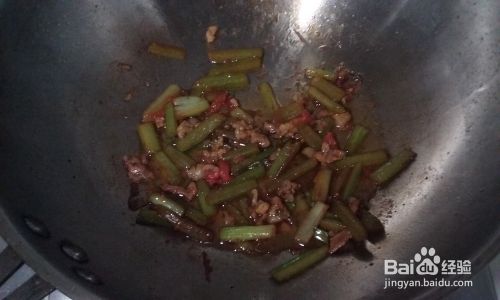 将切好的芹菜段倒入炒锅内,与肉搅拌,再加少许料酒继续翻炒。