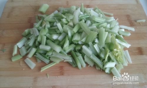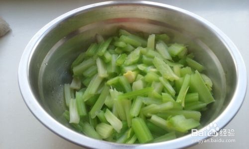 把 芹菜择净,去掉芹菜叶,洗干净,然后从两面把菜筋抽掉,再切成约2厘米长的小段备用。