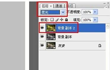 更改[背景 副本2]图层的图层混合模式为【柔光】选项。