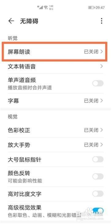 3、进入设置->智能辅助->无障碍->屏幕朗读,关闭屏幕朗读(屏幕朗读开启后,需要在目标位置先单击,再双击进入下一步操作)