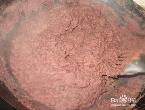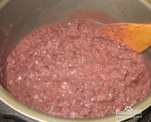 边翻炒,边继续翻捣豆馅,让豆馅均匀受热,直至感觉水分越来越少,豆馅越来越干为止。