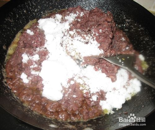 炒锅烧热,放少许油,放入捣好的豆沙,加适量白糖,翻炒。