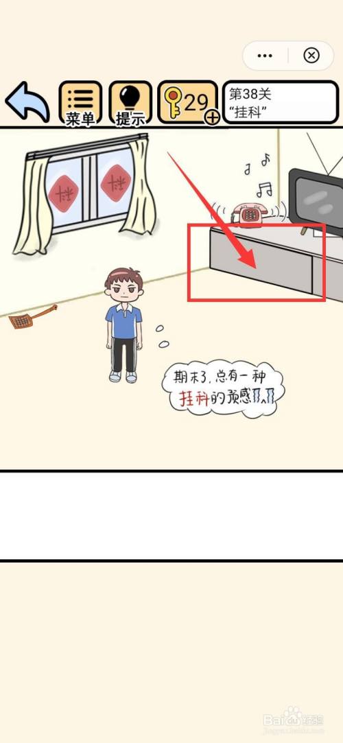 点击过关攻略 多图分析 我不要挂科38“挂科”中的电视机柜,发现一个福字和遥控器,放到下栏吧
