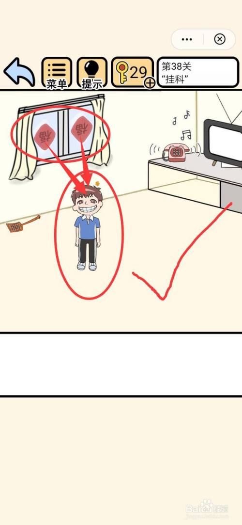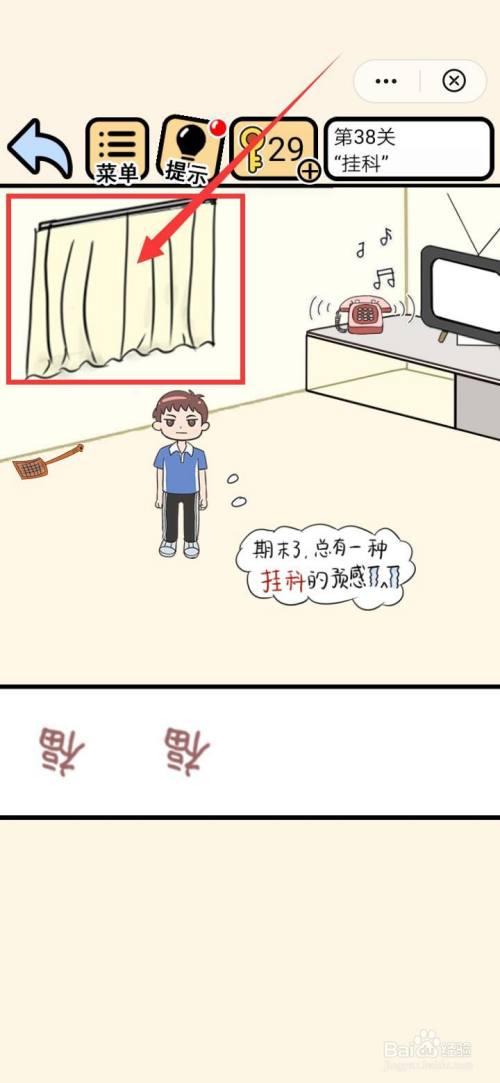 点击过关攻略 多图分析 我不要挂科38“挂科”的窗帘布,打开发现有两个“科”字,拖动福字去更换吧