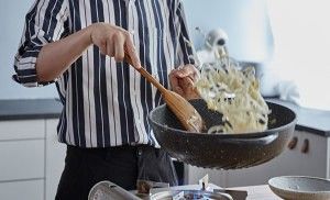 下粿条入锅翻炒一会,加生抽和老抽,继续翻炒均匀,盛出备用