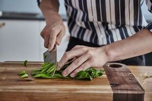 准备芥兰,用刀按压芥兰,斜刀切片,梗和叶分开放