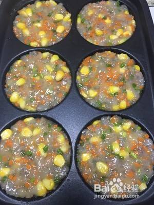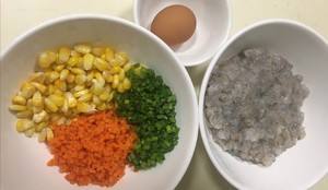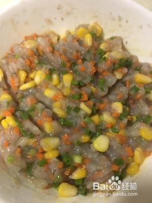 虾泥里面放入玉米、胡萝卜、葱花、打散的鸡蛋液,加入胡椒粉、盐、糖,搅拌均匀;