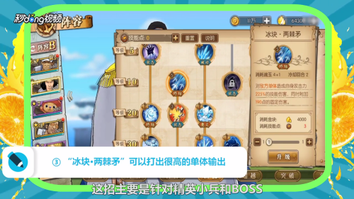 3接着是“冰块·两棘矛”,这招主要针对精英小兵和BOSS,因为是单体输出技能,所以平时打小兵时不太划算。
