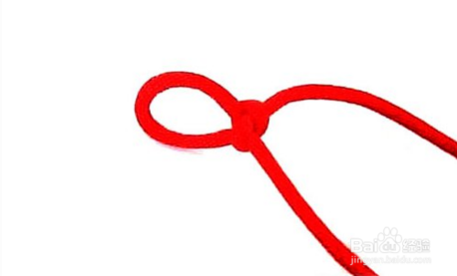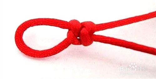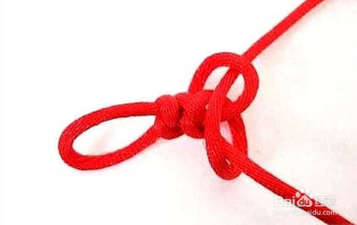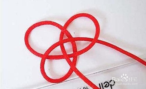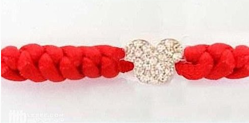准备6号线红绳,将线对折编花型,均匀拉紧,留出一个小孔当扣环,重复再编一个,拉紧交叉放好,再编一个拉紧,编至约手链总长的一半,穿入配饰,完成另一半。