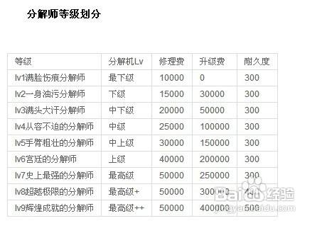 分解师和其他副职业一样,需要60级才能转职,分为7个等级(转职需要各色大晶体各2个加100个上级元素)。
