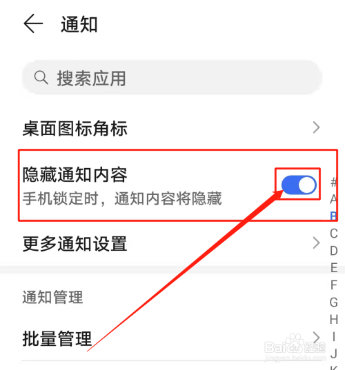 进入通知界面后,打开隐藏通知内容后面的开关即可。