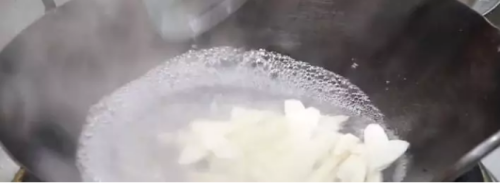 3.15秒后倒入胡萝卜片,用勺子翻动几下,再下入黄瓜片,焯水30秒后即可倒出控水;