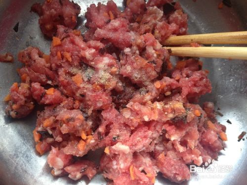 剁好的肉馅加入葱姜末和五香粉,盐进行搅拌。搅拌均匀以后放在一边入味。