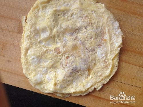摊好的蛋饼,放在案板上晾的不烫手为宜,准备包肉馅。