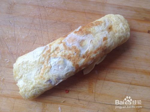 蒸熟的鸡蛋卷再次放在案板上面,切成小段即可食用。