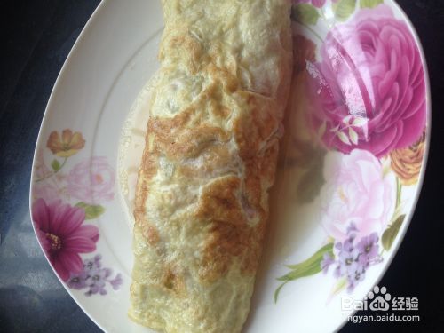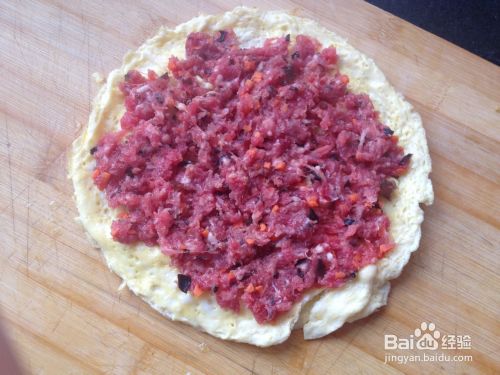 把猪肉馅均匀的铺在鸡蛋饼上面,卷起来。