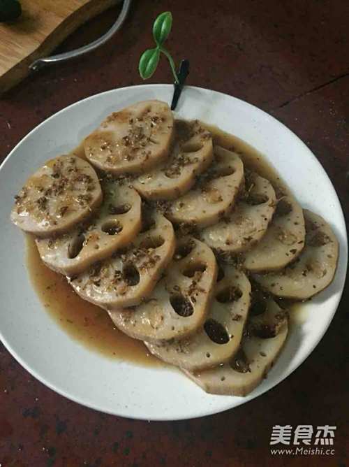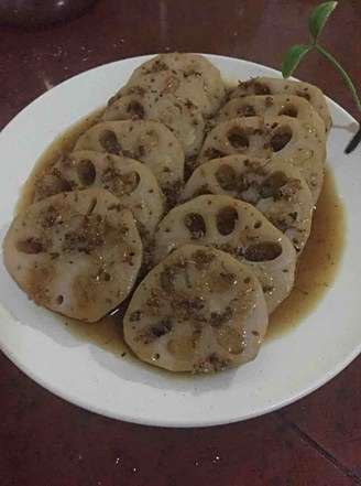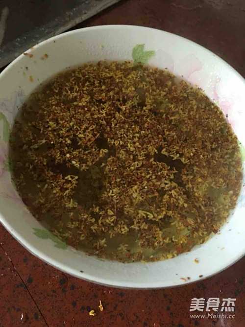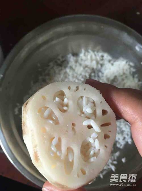 之前泡开的桂花连水一起到进去,水要和藕齐平才好。