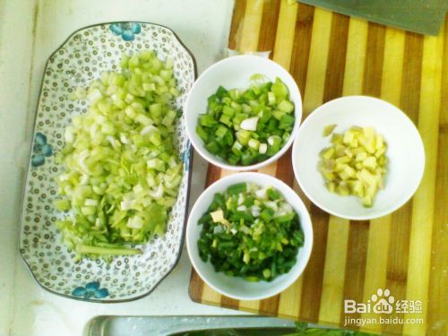 把芹菜、蒜苗、生葱、生姜洗干净切成小段,用碗碟装起来待用。