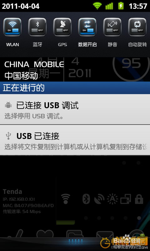 连接成功后,在手机屏幕左上角有一行状态区。按住状态区下拉出对话框,选择“USB连接”。