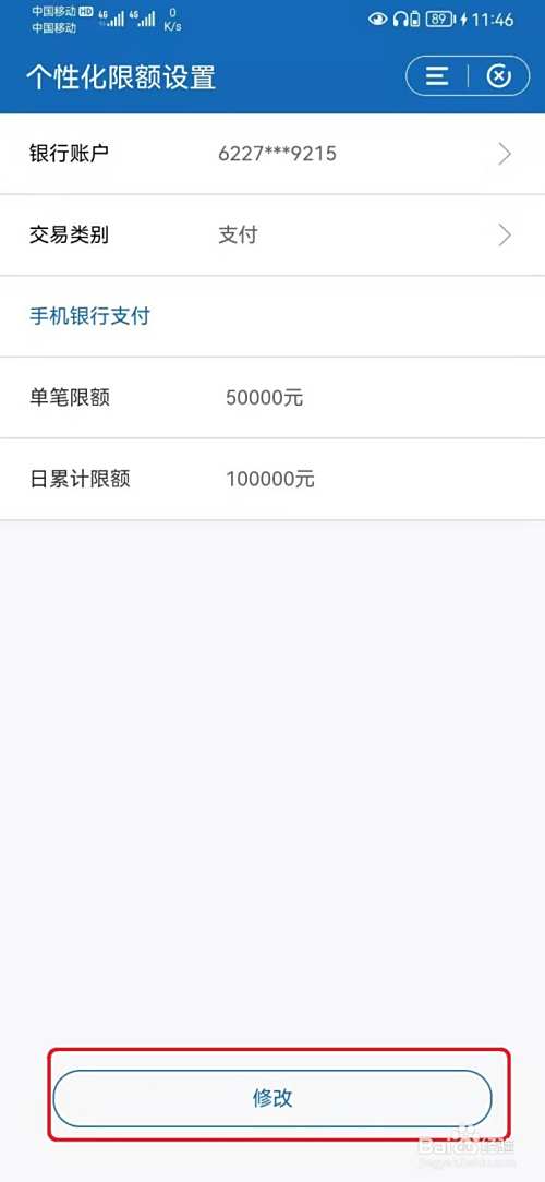 进入个性化限额设置页面,选择【支付】选项后,点击【修改】。