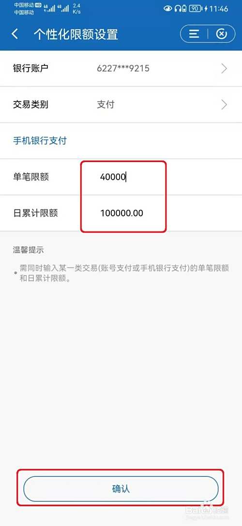 在个性化限额设置页面,修改支付单日限额额度后,点击【确认】即可。