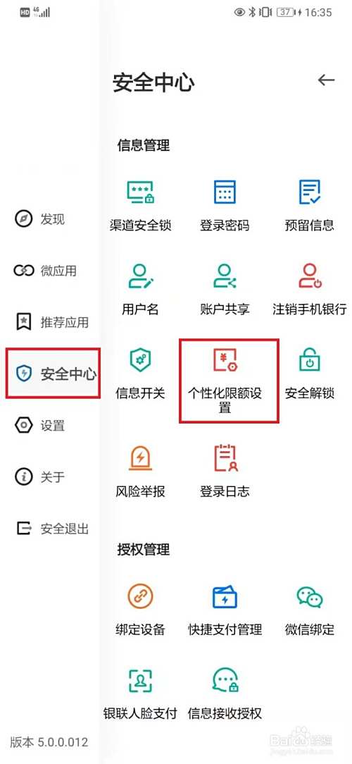 在更多服务页面,打开【安全中心】/【个性化限额设置】。