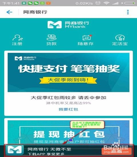 下方界面会弹出一个下载网商银行APP的界面,点击下载安装好网商银行APP!