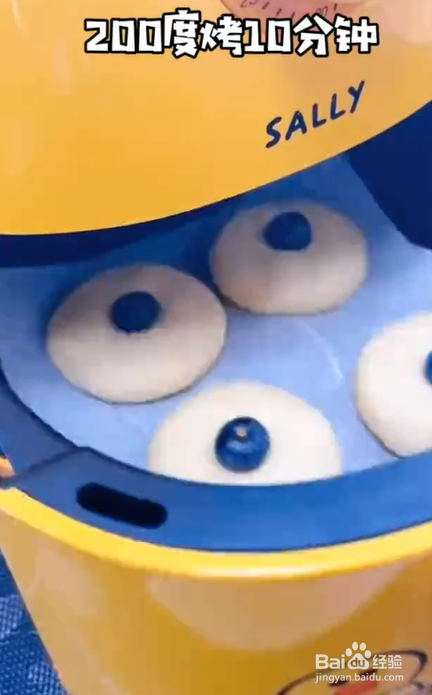 然后将面团拍成小面饼,上面放上蓝莓,烤箱设置200度烘烤10分钟就制作完成了