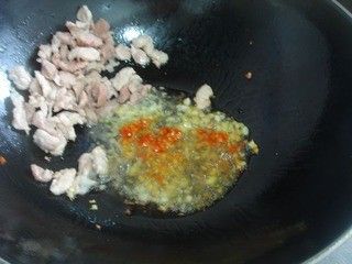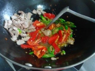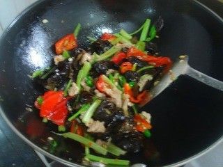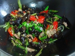 油锅烧热i,下青红椒爆炒,放五花肉同炒,再放入木耳,芹菜煸炒片刻。