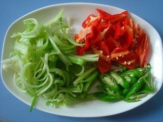 芹菜去叶,洗净,切段;青红椒均洗净,切片