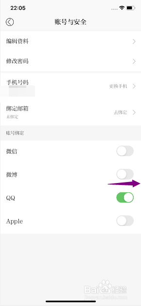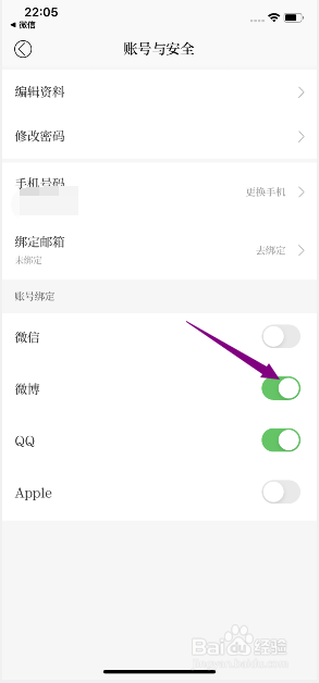 然后将微博的滑动按钮向右滑动。