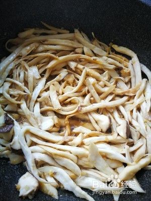 淋入生抽或味极鲜酱油,继续翻炒,让杏鲍菇再收缩点