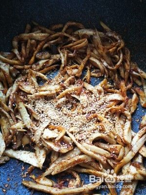翻匀后再把熟芝麻、白糖、盐撒上翻匀关火