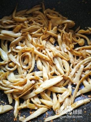 继续翻炒,杏鲍菇会开始收缩,慢慢出来点汤汁