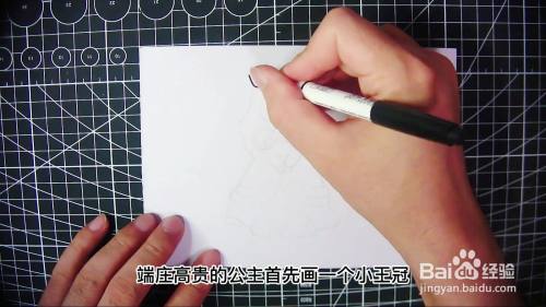 首先画一个小王冠,然后画人字形的头发,再画圆圆的脸。