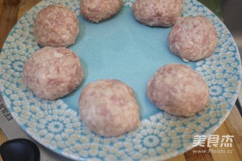 4用手抓起40克左右拌好的莲耦猪肉馅,左右摔打团成丸子