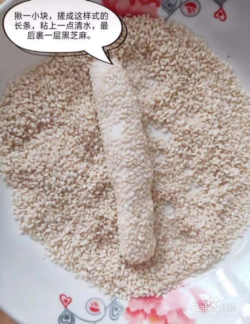 然后就出一小块搓成残条,沾上一些清水,最后裹上一层芝麻。