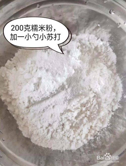 首先在一个比较大的容器当中加入200克的糯米粉和一小勺的小苏打。