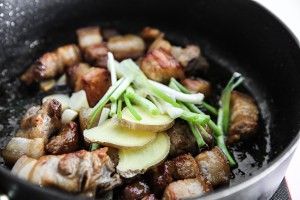 糖色上好后,加入葱姜蒜继续翻炒,这个步骤要把五花肉里的油煸炒出来,这样做出的肉不会肥腻哦