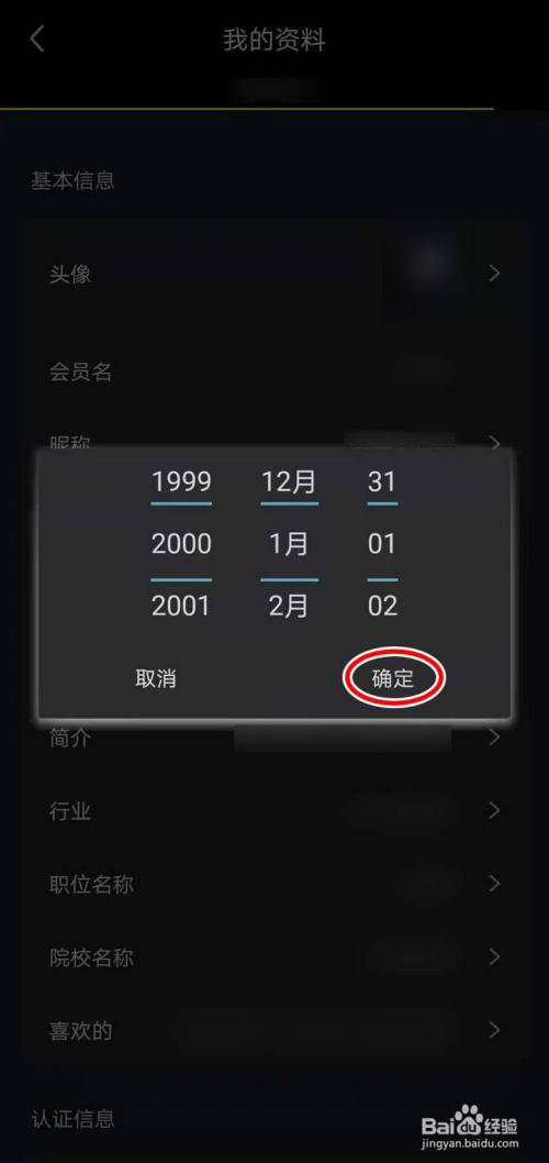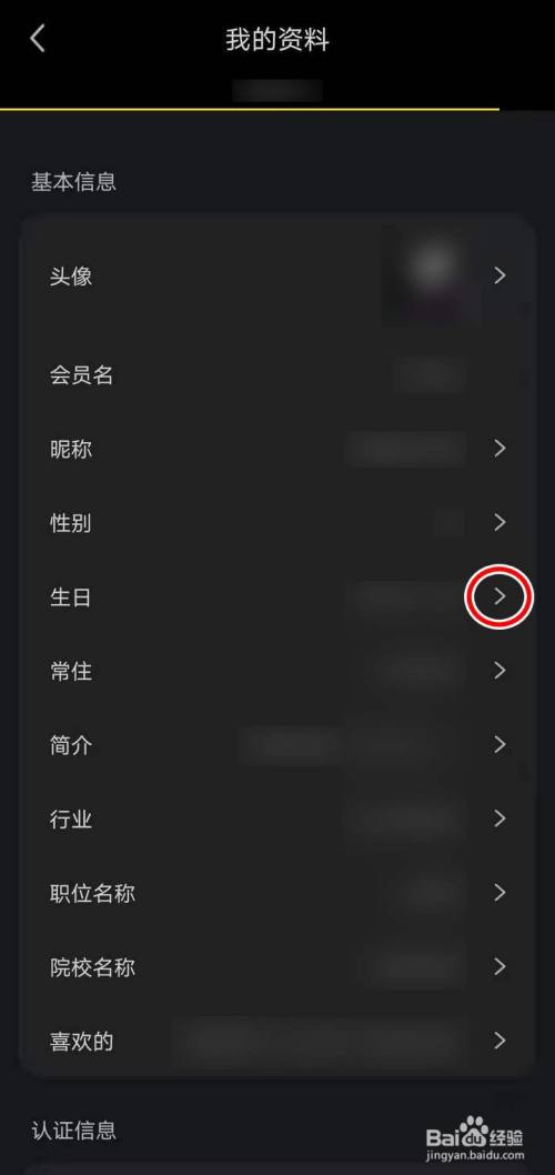 打开我的资料页面,项目详细包含十余项,选择生日右侧箭头;