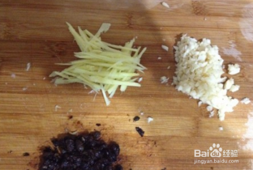 姜切丝,蒜剁蓉,豆豉用水泡一下,切碎