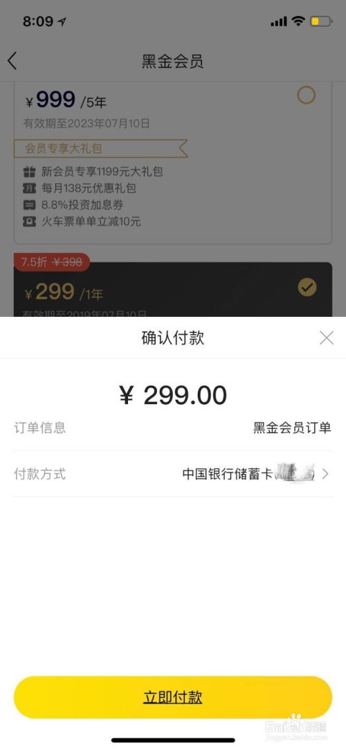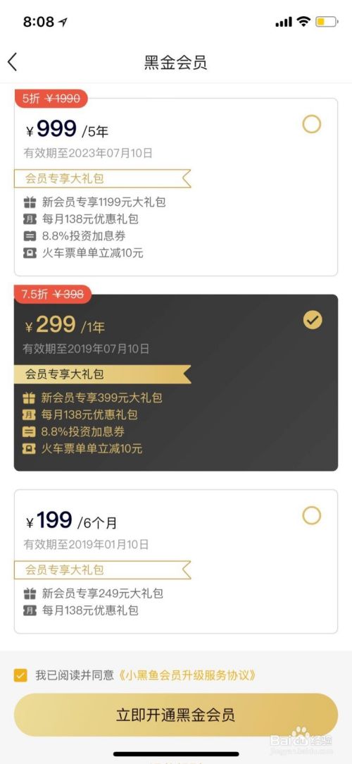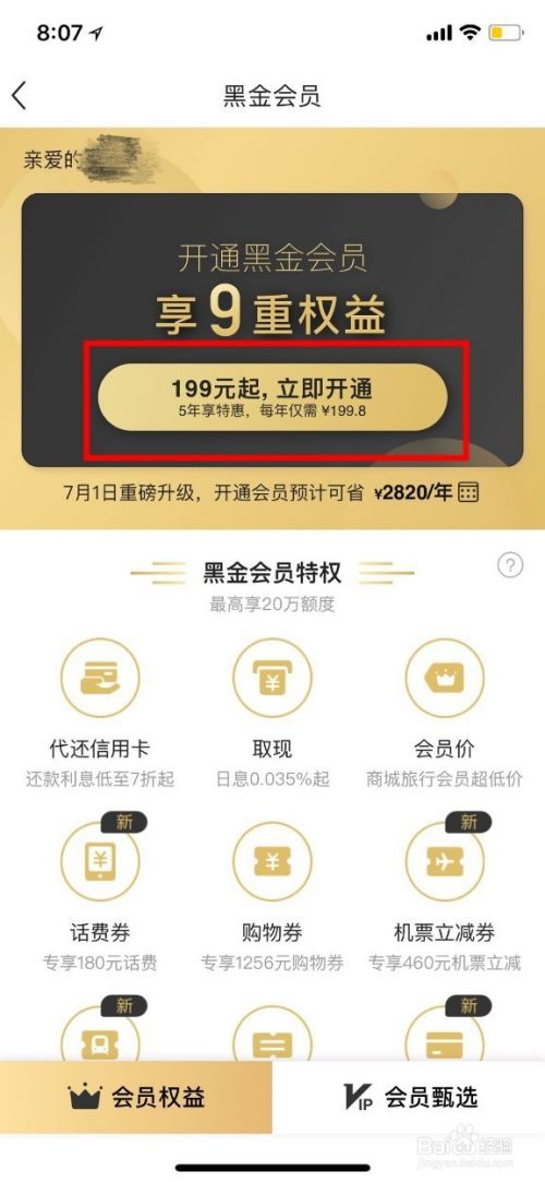 上步操作后即进入“黑金会员”界面,点击红框所示“199元起,立即开通”;
