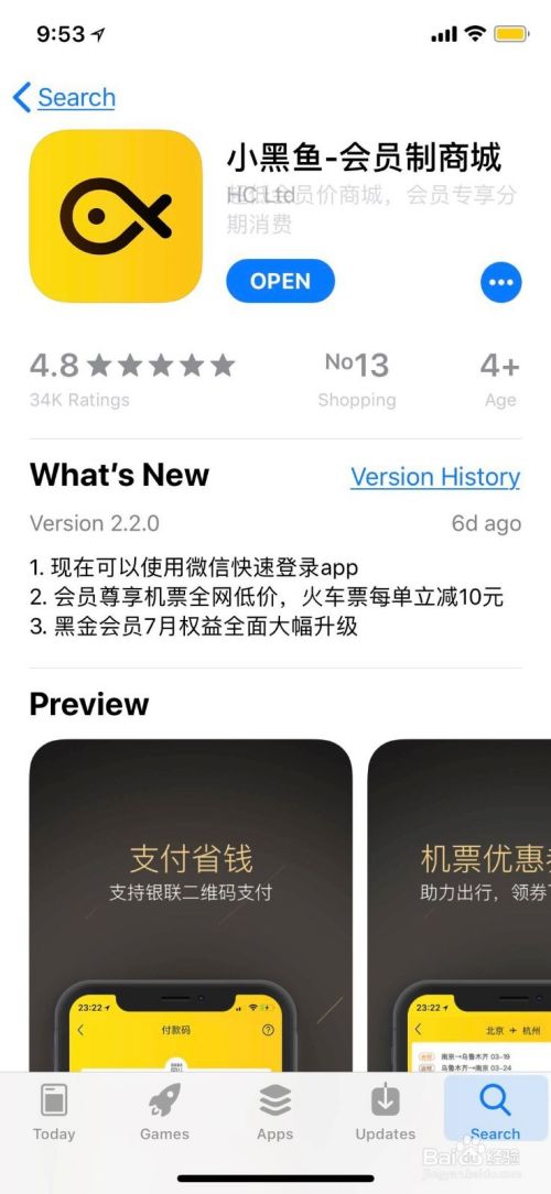 进入手机应用商店/app store,搜索“小黑鱼”,下载“小黑鱼”App;